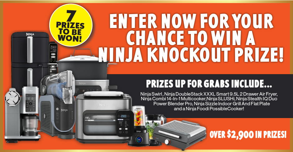 7 AMAZING PRIZES TO BE WON! Prizes include a Ninja Swirl , Ninja DoubleStack XXXL Smart 9.5L 2 Drawer Air Fryer, Ninja Combi 14-In-1 Multicooker, Ninja SLUSHi, Ninja Stealth IQ Duo, Power Blender Pro, Ninja Sizzle Indoor Grill And Flat Plate, and a Ninja Foodi Possible Cooker!